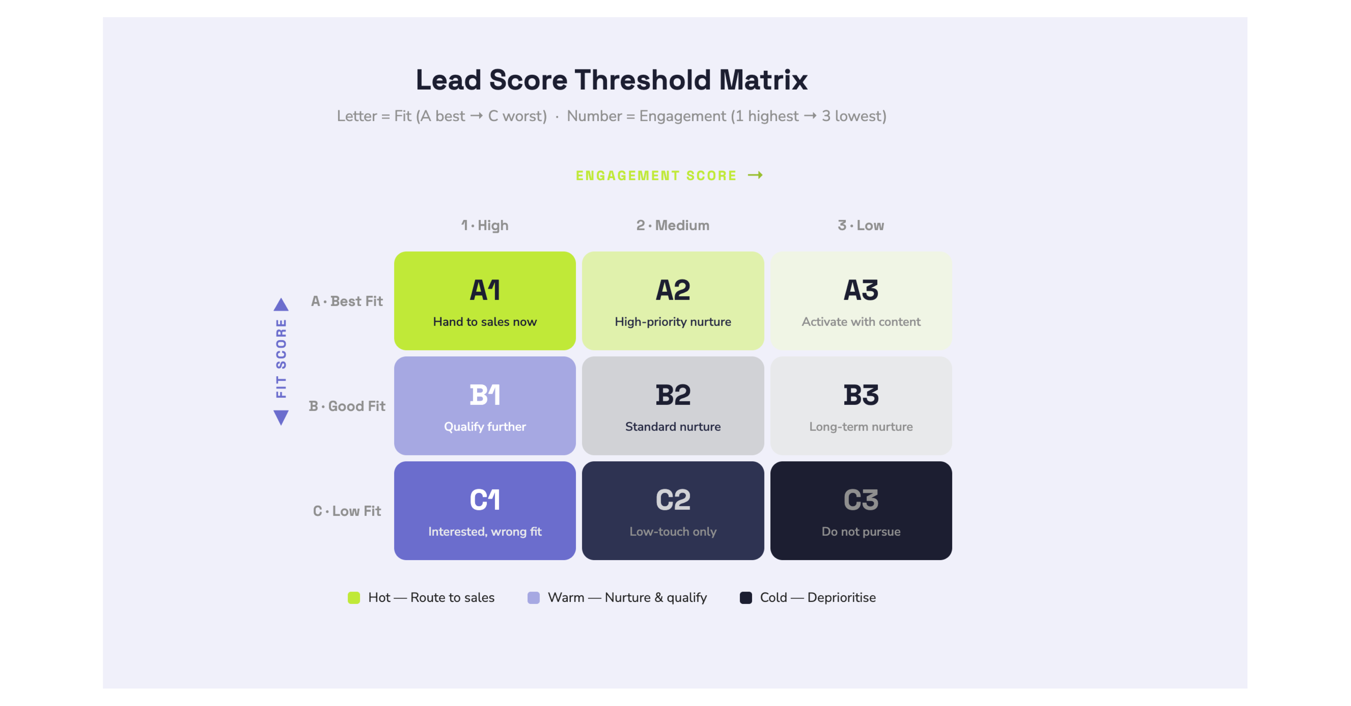 Use threshold categories instead of arbitrary numbers. Telling your sales team “follow up on leads scoring above 47” is less useful than “follow up on A1 and A2 leads.” The A1-C3 framework gives everyone a shared language.